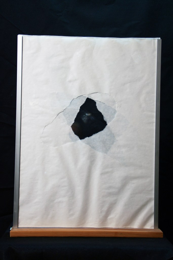 Al Wong, “Torn,” ©2014, 24″H x 18″W, Plastic, paper and aluminum. (View 1)